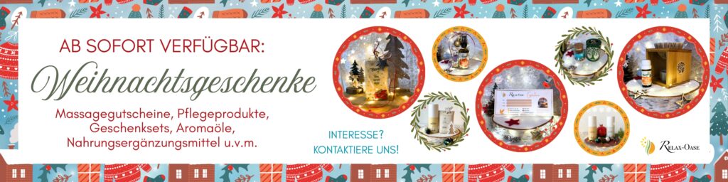 Relax-Oase Banner mit Logo, Blättern und dem Slogan "Gesundheit und Entspannung für Körper Geist und Seele"